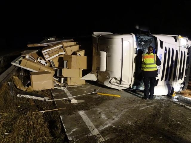 (jma) Evendorf: Vollsperrung der BAB7 zwischen den Anschlussstellen Evendorf und Egestorf nach LKW Unfall. Nach Polizeiangaben war gegen 01:00 Uhr der LKW zunächst vom Seitenstreifen in die Bankette geraten.