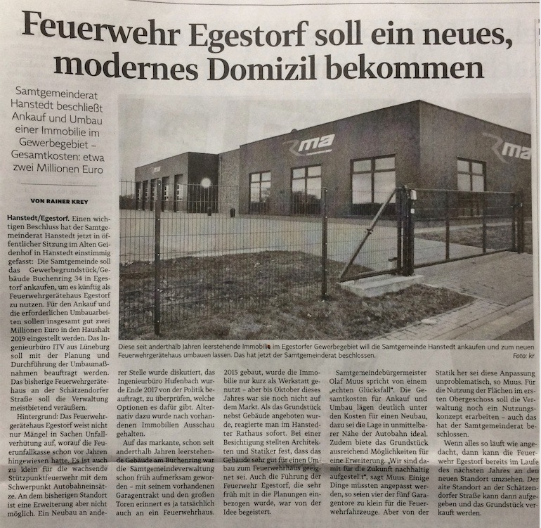 In seinem Jahresrückblick berichtete Witte von 19 Brandeinsätzen sowie 31 Hilfeleistungseinsätzen, zu denen die Wehr Egestorf im vergangenen Jahr ausrücken musste. Damit mussten mit insgesamt 50 Einsätzen deutlich weniger Einsätze abgearbeitet werden als noch im Jahr 2017 mit 84 Einsätzen. Zu den meisten Einsätzen kam es auf der angrenzenden Autobahn A7: dort galt es, diverse PKW- und Busbrände sowie verschiedene Unfallschadenslagen abzuarbeiten. Auch bei einem Großbrand in Eddelsen waren die Kräfte der Wehr Egestorf gefordert. Der Personalstand konnte mit aktuell 63 aktiven Mitgliedern um ein Mitglied gesteigert werden. Der Altersdurchschnitt ist mit 37,5 Jahren weiter gesunken, auch dieser Umstand sei als positiv zu bewerten, so Witte. Die Wehr Egestorf und die Samtgemeinde Hanstedt erhielten Ende des vergangenen Jahres die Gelegenheit, eine Gewerbehalle im Egestorfer Gewerbegebiet anzukaufen. Diese Gewerbehalle soll zu einem neuen Feuerwehrgerätehaus umgebaut werden, mit den Umbauarbeiten soll im Laufe des Jahres begonnen werden. „Wir hoffen, dass wir Anfang 2020 in das neue Feuerwehrhaus umziehen können“, so der Ortsbrandmeister.