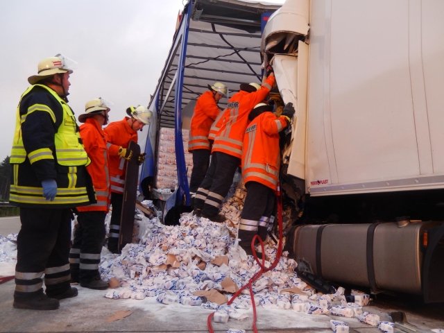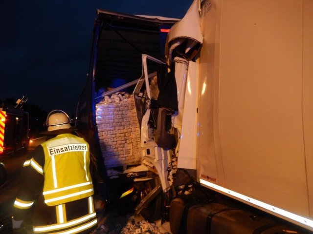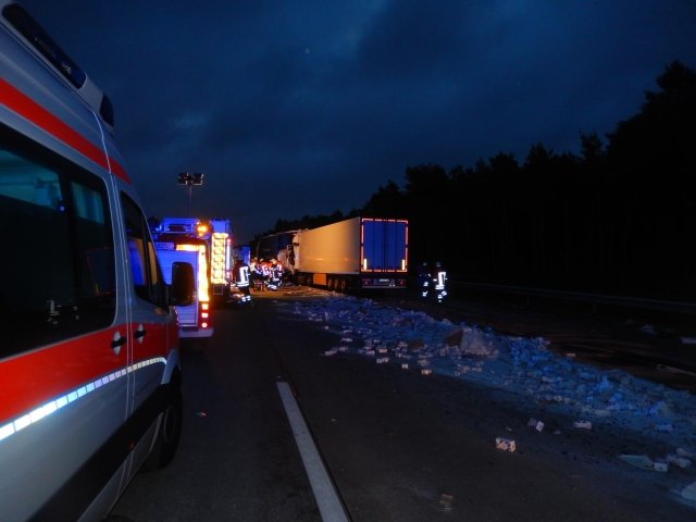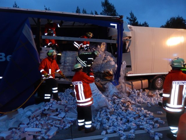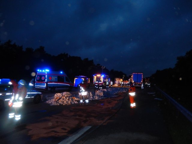 dass das vordere Gespann etwa sechzig Meter weiter über die Autobahn geschoben wurde. Hierbei wurde die Plane des vorausfahrenden LKW aufgerissen, weshalb sich neben größeren Trümmern auch mehrere Tonnen Haushaltszucker auf der Autobahn verteilten. Der Fahrer des auffahrenden LKW kam bei dem Unfall ums Leben und musste durch Kräfte der aus Egestorf und Sahrendorf-Schätzendorf angerückten Feuerwehren aus seinem völlig zerstörten Fahrerhaus geborgen werden. Um an die Kabine zu gelangen, musste die Feuerwehr zunächst weitere Teile der Ladung entfernen. Da durch den aufgerissenen Fahrzeugtank auch mehrere hundert Liter Diesel ausgelaufen waren, wurde die Einsatzstelle großflächig mit Ölbindemittel abgestreut sowie die entsprechende Fachbehörde des Landkreises Harburg zur Einsatzstelle gerufen. Nach Angaben der Polizei war es auf Grund eines Wildwechsels zu dem Stau gekommen, auf dessen Ende der Fahrer aufgefahren war.