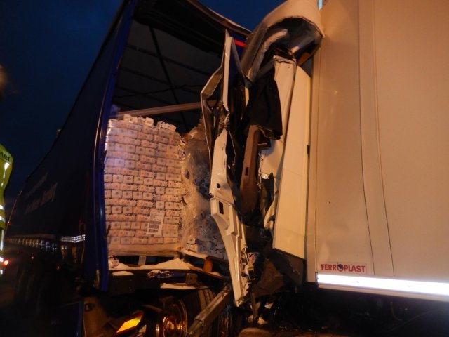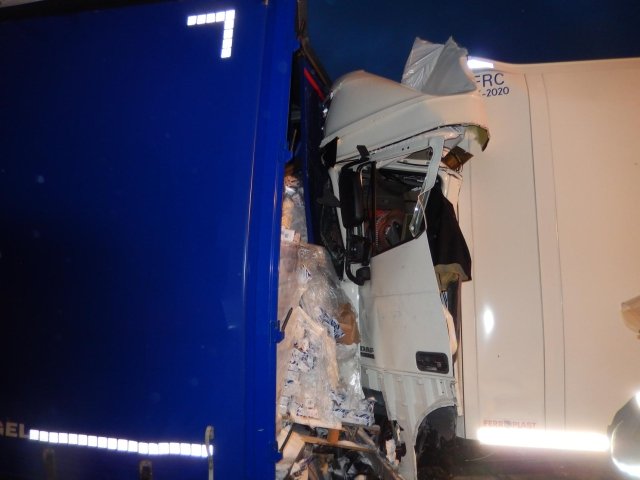 beladener LKW auf einen am Stauende langsam rollenden Lastkraftwagen auf. Der Aufprall war so stark,